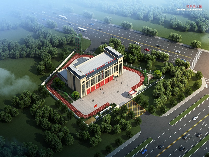 大集消防站項目位于蔡甸區(qū)大集街知音湖大道與天鵝湖大道交叉口西南角,總建筑面積3848.62平方米,平行知音湖大道布置1棟4層業(yè)務大樓,南端垂直業(yè)務大樓附建1棟1層食堂,另外配套有訓練塔、門房等輔助設施。業(yè)務大樓和食堂外側(cè)為環(huán)形消防車道(兼作訓練跑道),項目分別朝向知音湖大道和天鵝湖大道開設主、次出入口。