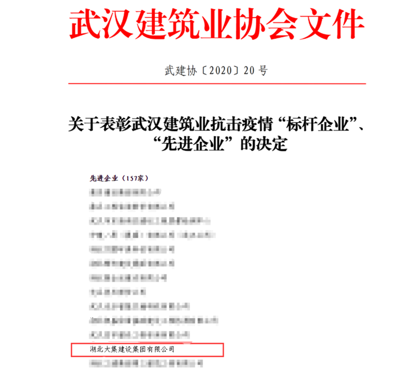 4月14日,武漢建筑業(yè)協(xié)會發(fā)布《武建協(xié)〔2020〕20 號——關(guān)于表彰武漢建筑業(yè)抗擊疫情“標桿企業(yè)”、“先進企業(yè)”的決定》,對在抗疫“主戰(zhàn)場”積極擔責,奮不顧身、盡銳出戰(zhàn),與死神賽跑、與疫魔競速的27家武漢建筑業(yè)“標桿企業(yè)”、157家“先進企業(yè)”進行表彰。湖北大集建設(shè)集團因在抗疫過程中主動作為、勇于擔當,獲評“先進企業(yè)”榮譽稱號。